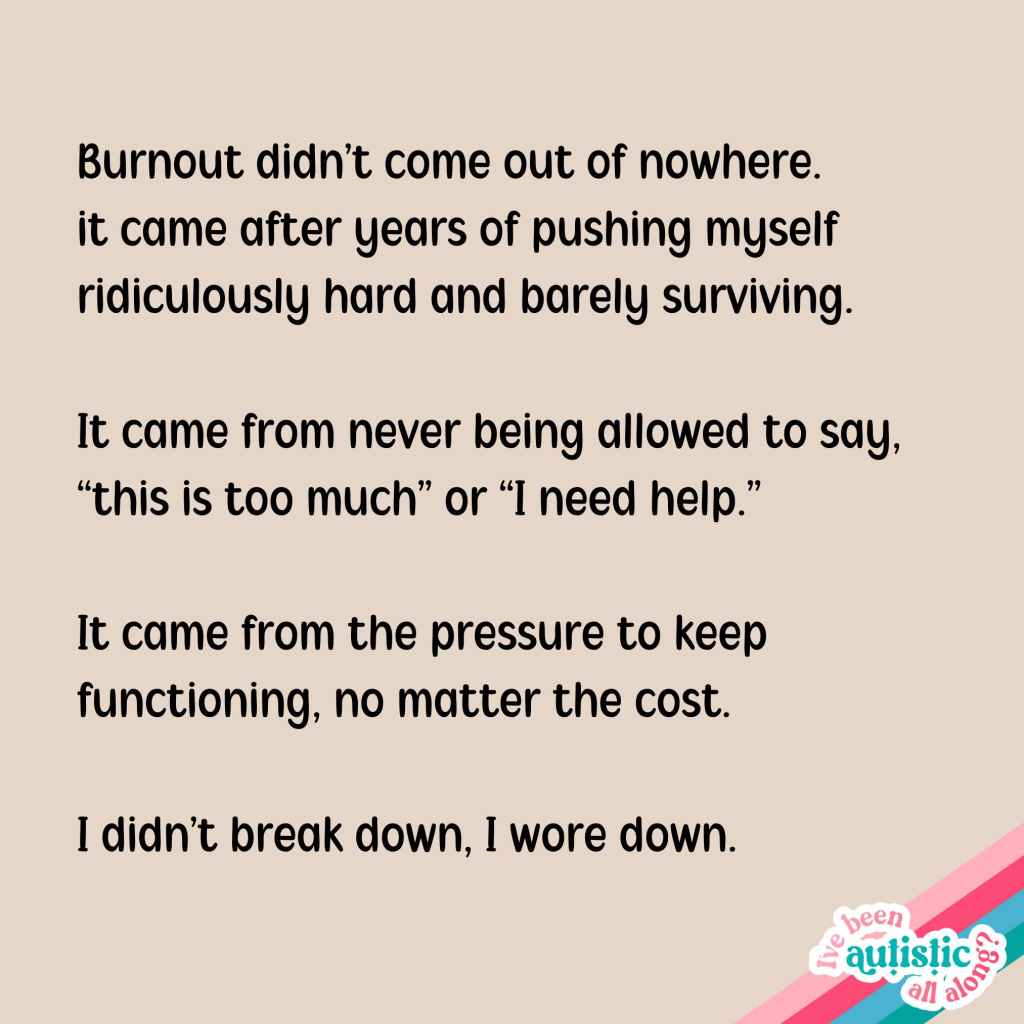 If you are experiencing a more profound level of burnout, then you may be experiencing this kind, which may imply that you are Autistic and or ADHD (probably both). It is important to consider this and seek a professional who is qualified and experienced in Autism and ADHD to properly assess and if relevant diagnose you for these conditions.