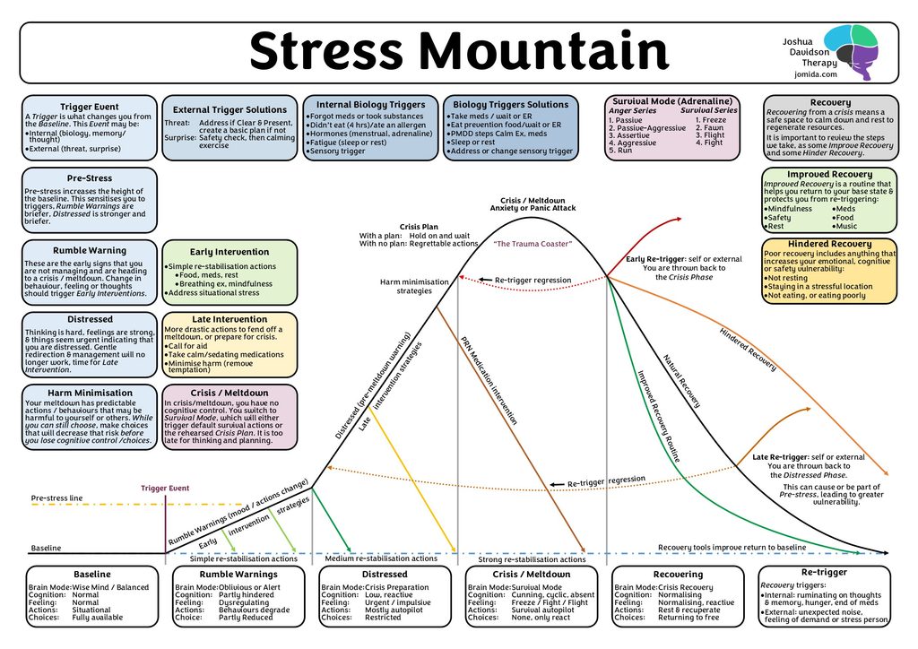 A good Safety Plan follows the changing capability of the person a la Stress Mountain. That means that intervention strategies like “breathing exercise” or “meditation” are in the Rumble Phase, as these only work as Early Interventions and fail as Late Interventions. Usually, by the time someone needs to intercede, the person is now in the Distress Phase. The Distress Phase requires Late Intervention strategies: removing self or stressor, seek help, medication, harm minimisation.