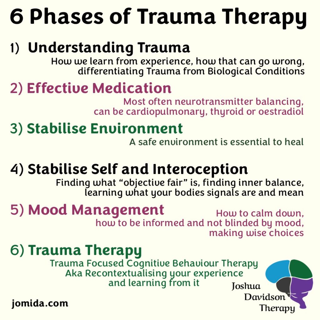 The gold standard for Trauma Therapy is a modified Cognitive Behaviour Therapy – Trauma CBT (sometimes tCBT, or TF-CBT [Trauma Focused CBT]). This should be in conjunction with other therapies for a holistic treatment plan. Specifically, a medical expert who can prescribe relevant medications, the therapist performing the Trauma Therapy on the backbone of CBT, other therapies to help target specific maladapted behaviours and or neurodivergent traits that are uncovered, potentially a relationship counsellor, domestic violence counsellor, home support and so on depending on what may be de-stabilising the client. In my case, I do all of the bits listed after the medication and I’m not shy about making recommendations for which medications types I think are most likely to help, which is often useful as many doctors are not well versed in which medications actually help PTSD (often not SSRI).